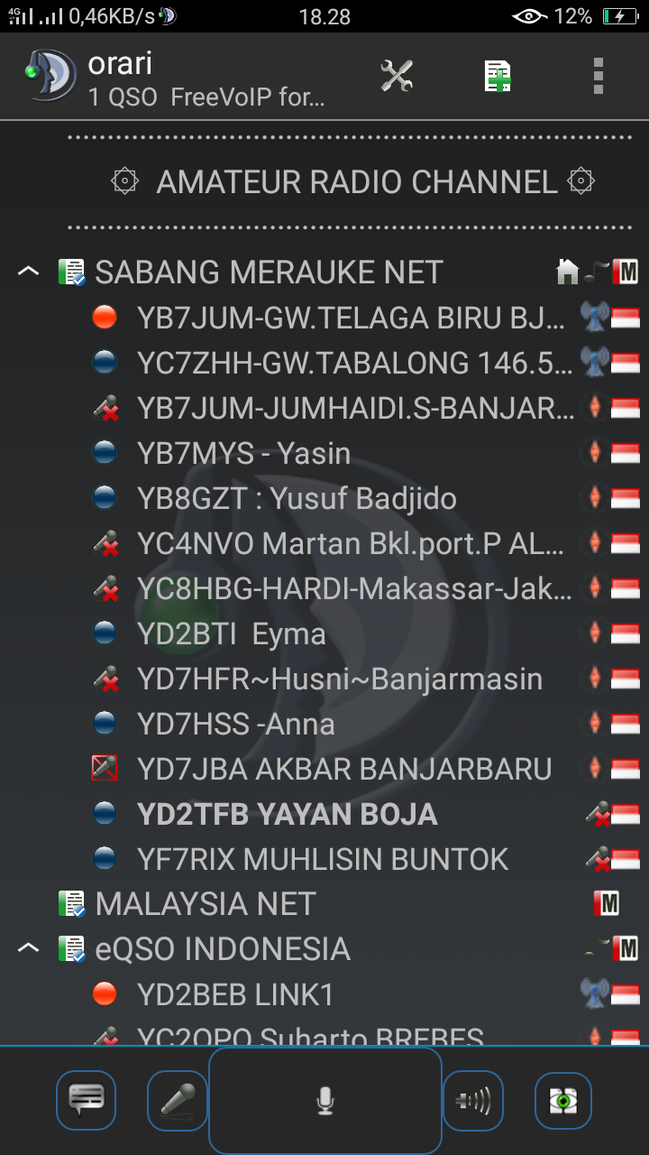 Setelah di save akan nampak seperti Gambar 1 lagi, selanjutnya klik Bookmark yang telah dibuat tadi ( *tulisan “orari” ) Maka aplikasi akan mencoba konek ke server yang telah di bookmark yaitu server samernet.link . Jika koneksi internet Anda bagus beberapa detik akan segera terhubung. Dan Anda akan berada pada room ter atas, yaitu room SAMERNET (Sabang Merauke Net). Biasanya pada jam-jam diluar kerja atau waktu senggang banyak teman-teman amatir radio yang terlihat Callsign dan nama mereka (seperti nampak pada Gambar 5 ). Jika ada nampak titik warna biru menyala berarti orang tersebut sedang melakukan pembicaraan (transmite) maka dari itu sebelum nya dengarkan dulu beberapa saat, apakah yang sedang dibicarakan disitu.