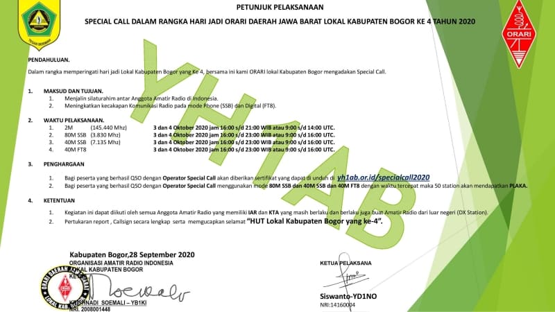 Kegiatan Spesial Call/ Spesial Event Station SES YH1AB ini terbuka bagi seluruh anggota Amatir Radio Indonesia yang memiliki IAR dan KTA yang masih berlaku dan terbuka untuk anggota Amatir Radio stasiun DX.