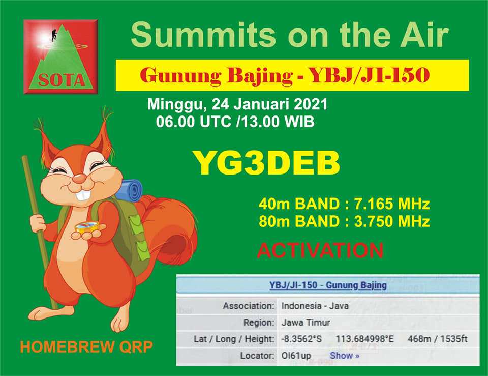 Activation Gunung Bajing YBJ/JI-150 akan memanggil melalui 40m band di 7.165 MHz dan 80m band di 3.750MHz dengan operator YG3DEB