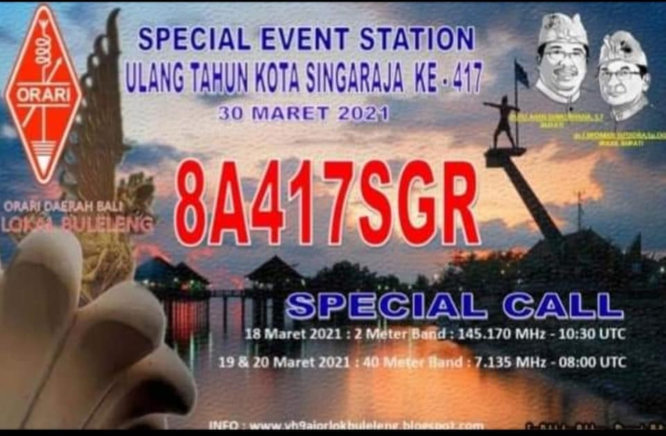 ORARI Daerah Bali Lokal Buleleng yang beralamat di Jl. Pramuka N0.09 Singaraja Bali 81114, dalam rangka memperingati dan memeriahkan Hari Ulang Tahun Kota Singaraja ke-417 yang jatuh pada tanggal 30 Maret 2021 mengaktifkan Special Event Station atau Special Call dengan Callsign 8A417SGR.