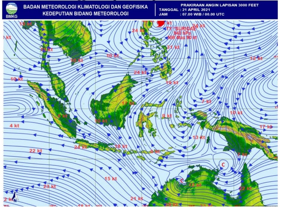 Terhadap cuaca di Indonesia Siklon tropis SURIGAE memberikan dampak tidak langsung terhadap cuaca di wilayah Indonesia dalam 24 jam ke depan berupa :